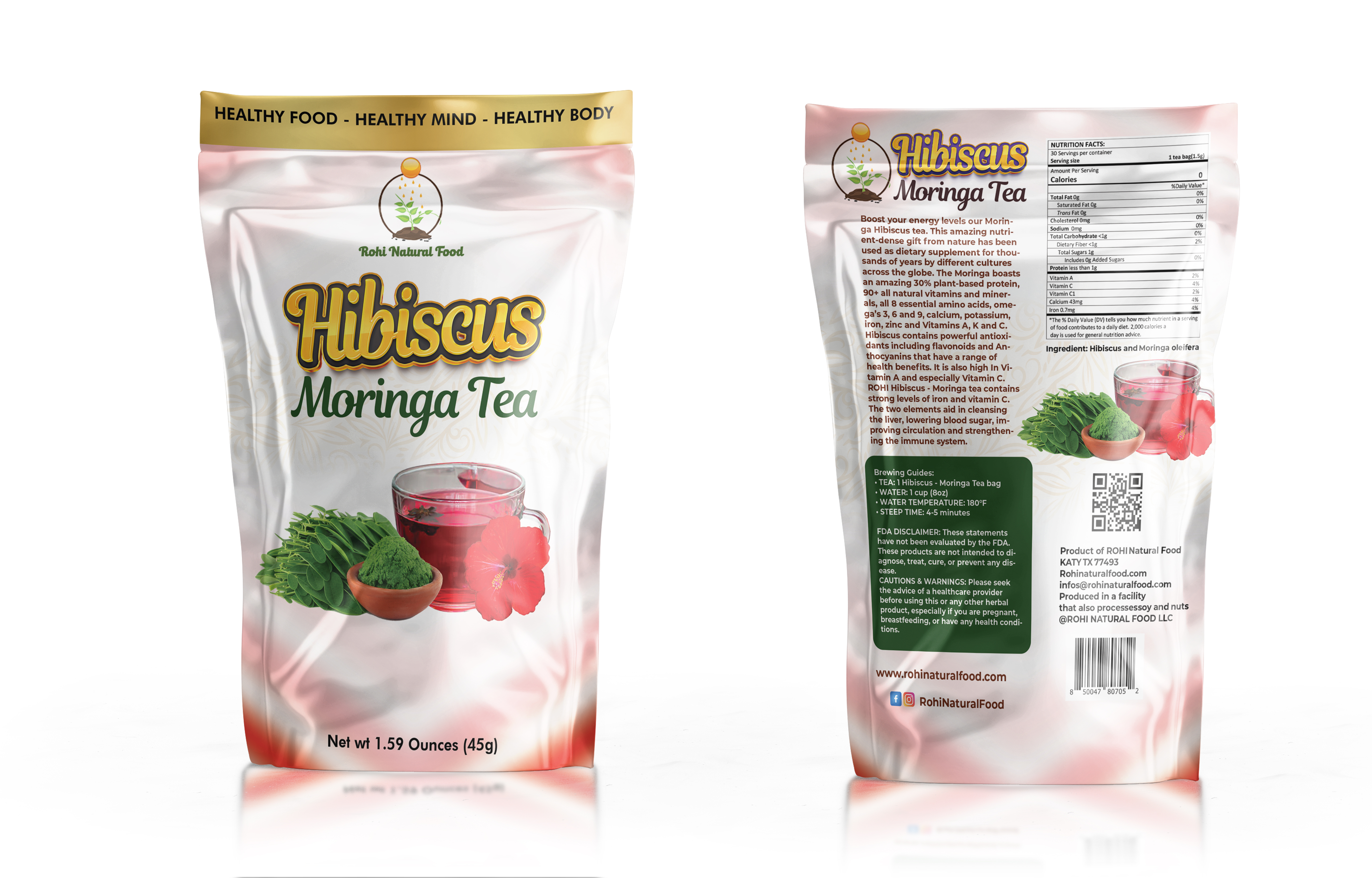 ROHI Hibiscus - Moringa tea contains strong levels of iron and vitamin C. The two elements aid in cleansing the liver, lowering blood sugar, improving circulation and strengthening the immune system.